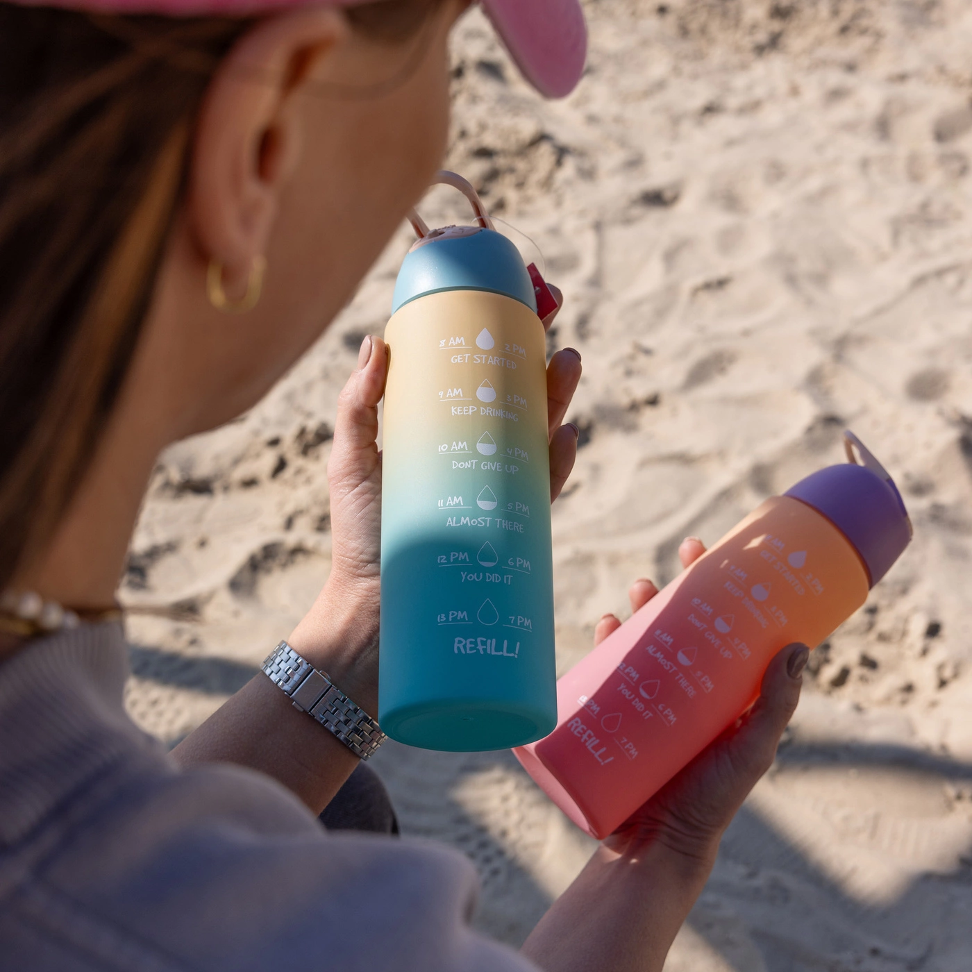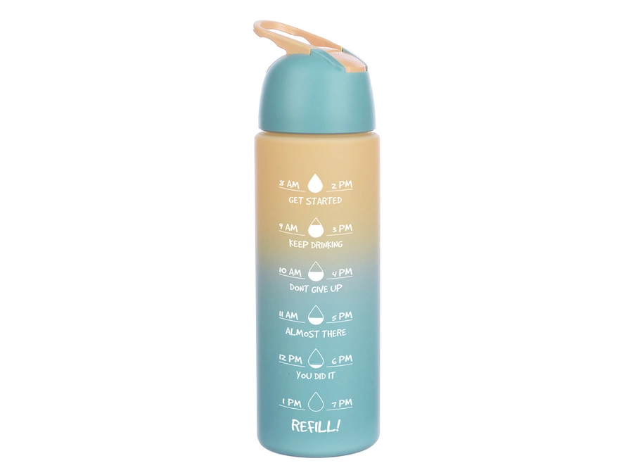 Dzięki ozdobnej miarce z oznaczonymi godzinami i motywującymi hasłami, możesz na bieżąco śledzić ilość wypitej wody, aby pozostać dobrze nawodnionym. Zakrętka butelki posiada uchwyt, który pozwala łatwo przenosić butelkę, a blokada otwarcia zapobiega rozlaniu zawartości.