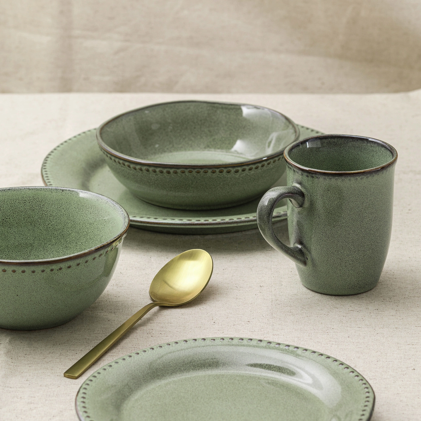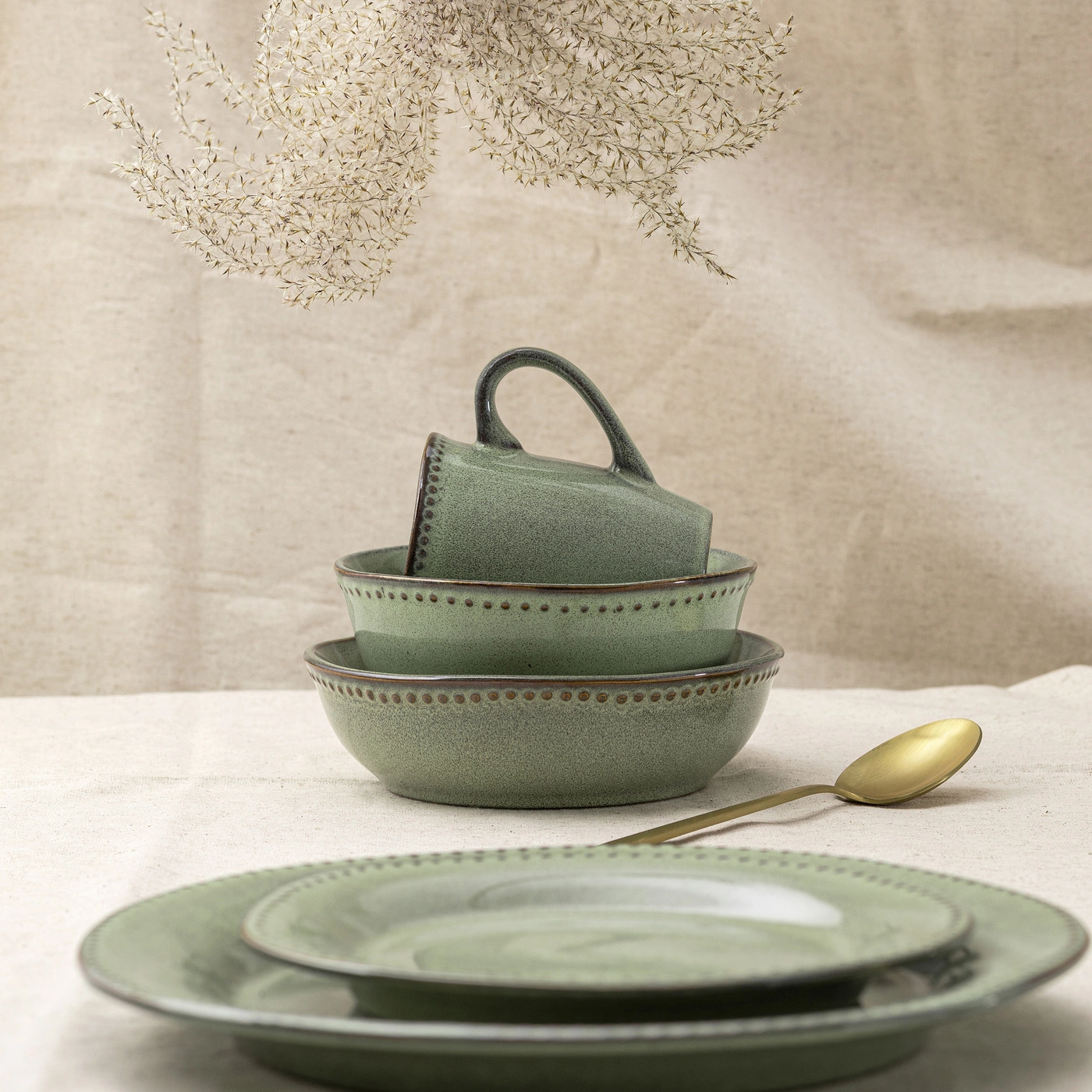 • Ceramika Rusty Dots w rustykalnym stylu dodaje elegancji i stylu każdej jadalni, dzięki wyjątkowemu odcieniowi zieleni oraz kropkom na brzegach naczyń. Wszystkie naczynia z linii nadają się do podgrzewania w kuchence mikrofalowej i mycia w zmywarce.