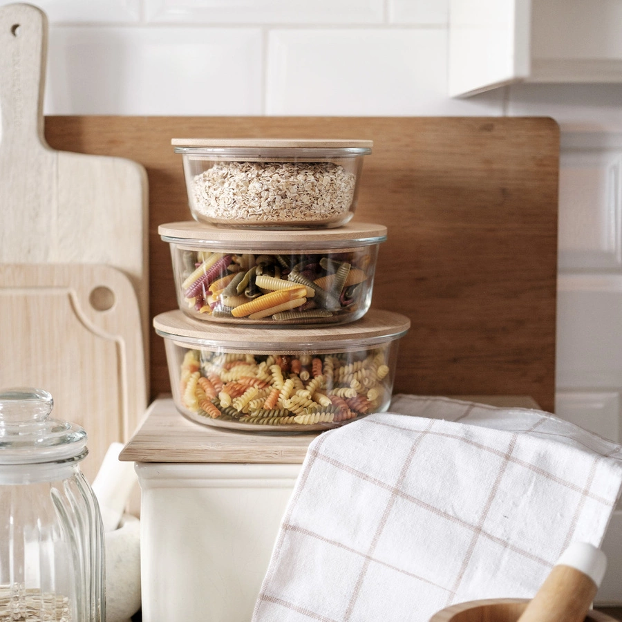 - Pojemnik szklany z bambusową pokrywką jest idealny do przechowywania żywności w lodówce. Naczynie możesz też używać do zapiekania, podgrzewania w mikrofali i mrożenia jedzenia. Pojemnik nadaje się do mycia w zmywarce.