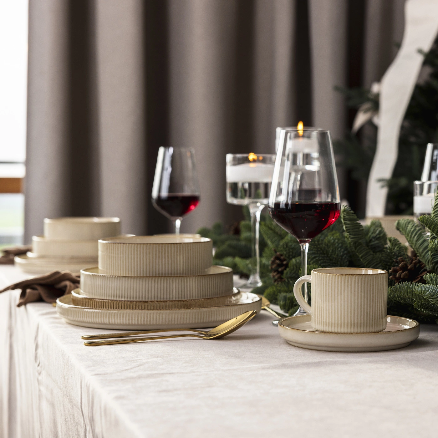 Talerz głęboki Evia zachwyca swoją niezwykłą estetyką. Jego kremowy odcień delikatnie łagodzi każdą potrawę, tworząc atmosferę spokoju i elegancji. Co wyróżnia ten talerz spośród innych, to jego unikalna prążkowana struktura, która nadaje mu wyjątkowy charakter i sprawia, że aż chce się z niego jeść.