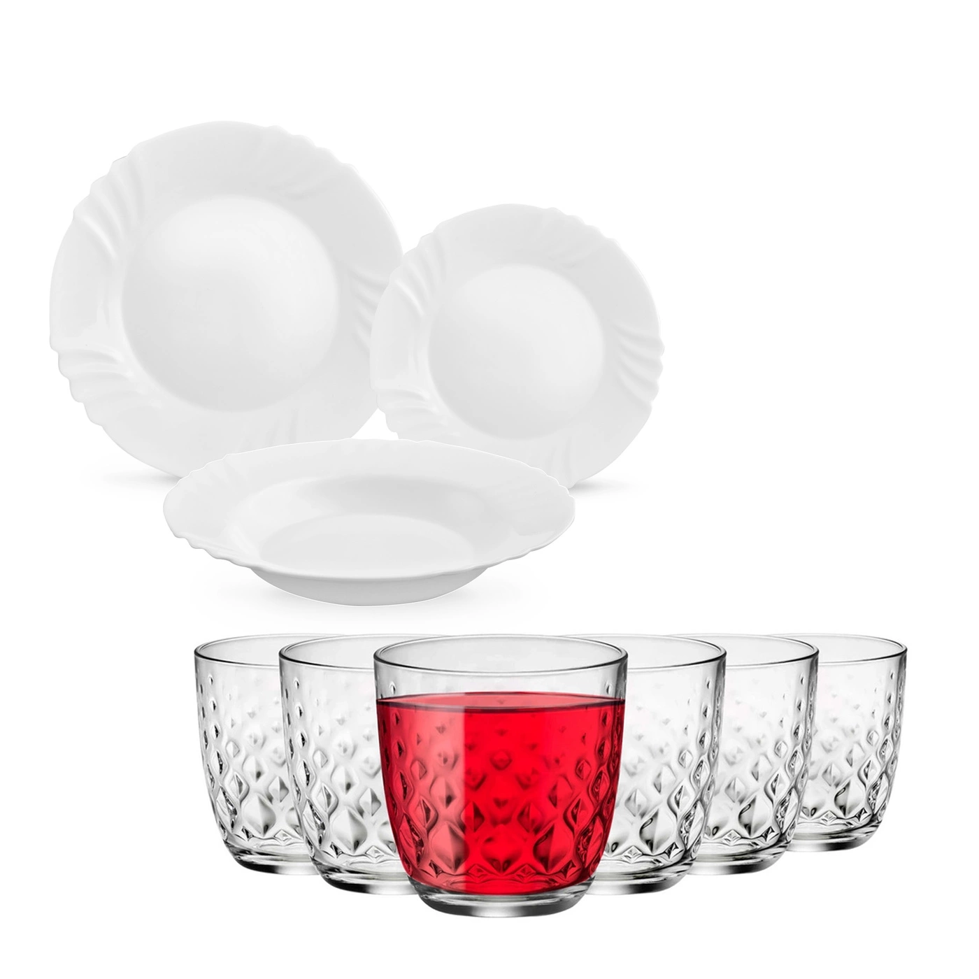 Talerze obiadowe Bormioli Rocco Ebro 18 elementów oraz komplet szklanek do soków Bormioli Rocco Glit 300 ml